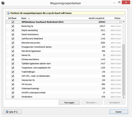 De waypointdatabase bestaat uit Waypointgroepen die u in WinGPS 5 zelf kunt instellen voor een optimaal kaartbeeld. Deze database wordt door het editiejaar een aantal keren bijgewerkt en kunt u via WinGPS eenvoudig en snel bijwerken.