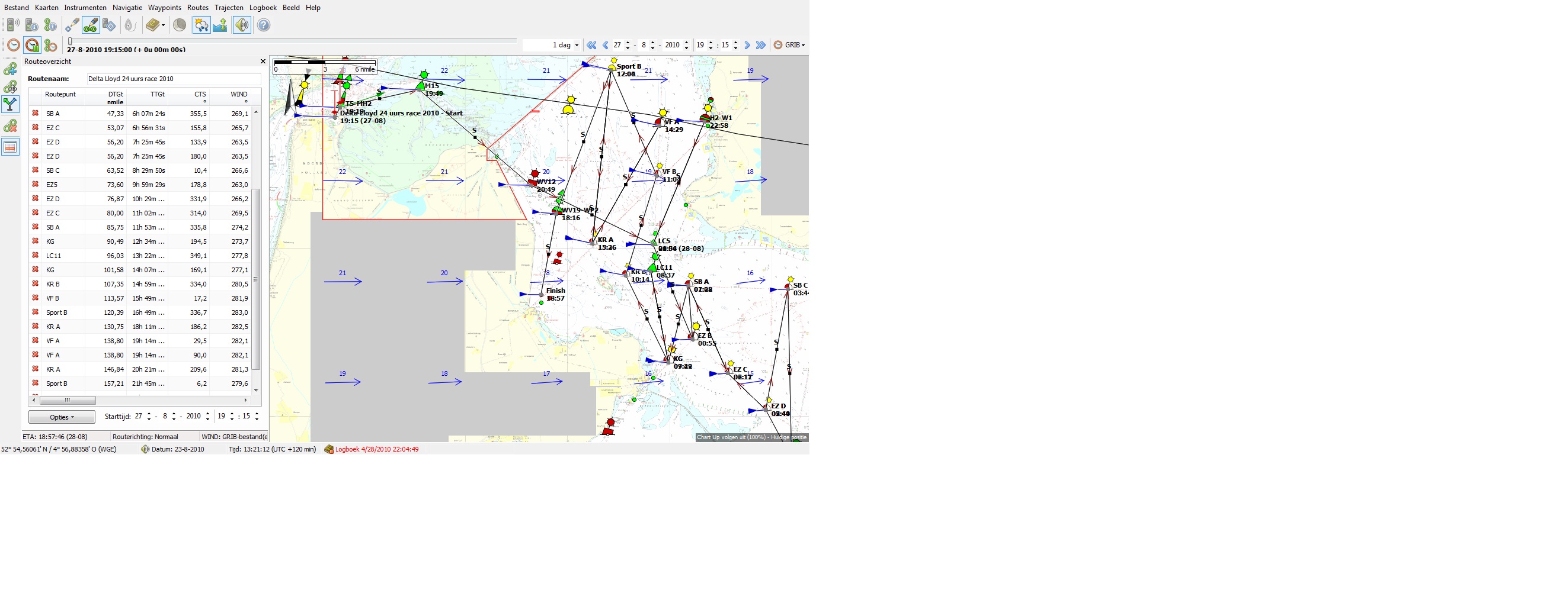 Voyager maakt gebruik van Grib files. Zie hieronder de voorspelling van de ochtend van 19e augustus. Medemblijk en Den Oever lijken nu goede startposities. Zie Voorbeeldroute met Maxi 999. Ook de Waddenroute zou gunstig kunnen uitpakken als je voordeel kunt halen uit de getijstroom. Met Voyager is dit goed door te rekenen.